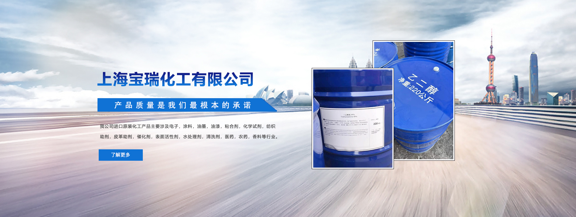 上海寶瑞化工有限公司組建于二00三年,是專門經營進口原裝化工原料的專業化工公司. 公司自創建以來. 一直致力于國內外市場的開發,不斷拓寬經營渠道,擴大經營規模,并且與美國DOW , SHELL , EXXONMOBIL,德國BAYER, BASF。法國ARKEMA ,韓國LG ,SKC,南非SASOL南京揚子石化.上海金山石化,吉林吉化等多家企業建有長期隱定的合作關系。我司的銷售網絡主要遍及華東地區。 與多家外資企業,中外合資企業,民營企業建立了直供的業務關系.為行業的高端廠家提供優質原料和專業周到的服務。在和國內外優秀企業建立良好的合作關系的同時,我司還將我們所掌握的國內外多種行業的發展信息反饋給我們的相關行業的客戶,為我們的客戶提供了眾多其本行業所發展趨勢的信息,并積極引導客戶掌握最新產品行情和工業技術。贏得了國內外合作伙伴的贊賞和信任。